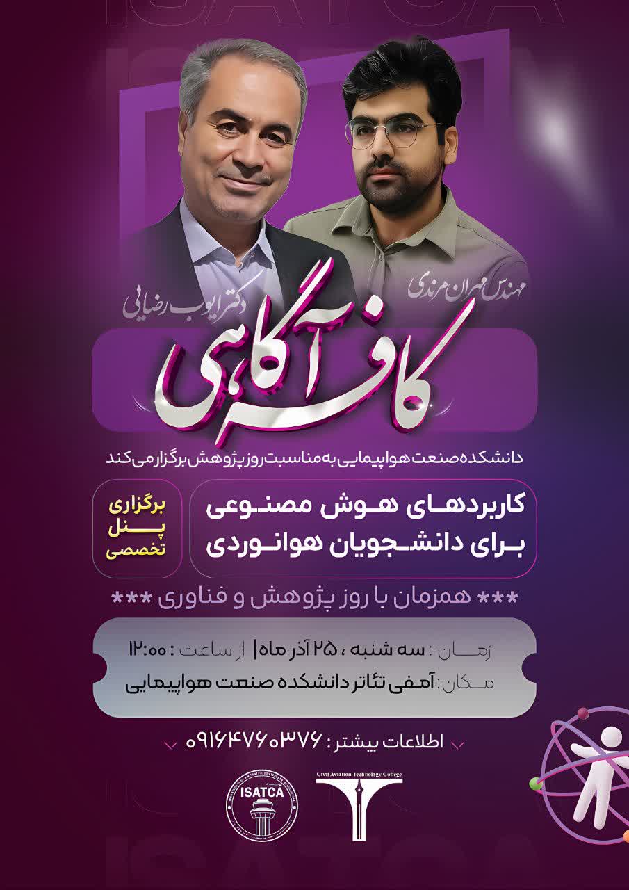 دانشکده صنعت هواپیمایی کشوری به مناسبت روز پژوهش و فناوری برگزار میکند: پنل تخصصی با موضوع 《کاربردهای هوش مصنوعی برای دانشجویان هوانوردی》 دکتر ایوب